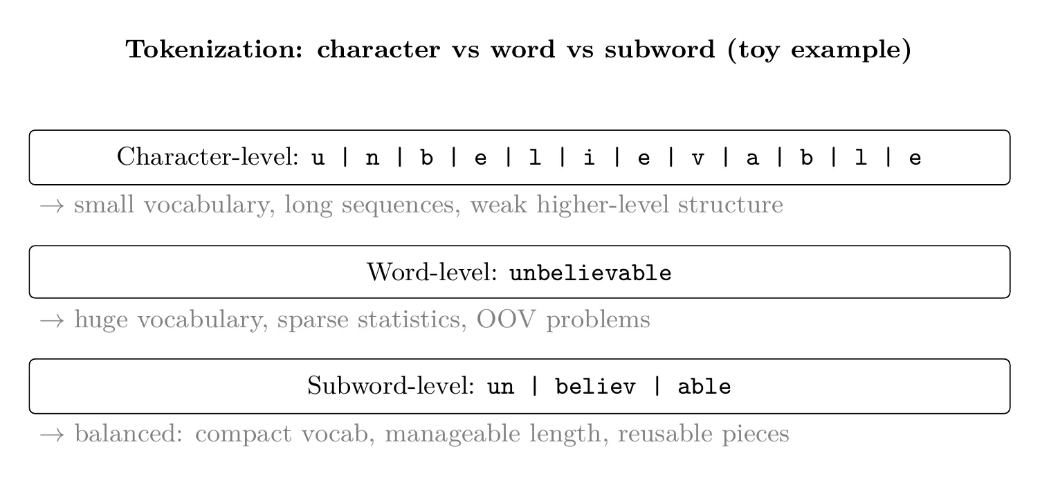 Figure 1 — Tokenization trade-offs. Comparison of character-level, word-level, and subword-level tokenization using a toy example. Character-level representations have small vocabularies but long sequences and weak higher-level structure. Word-level representations are compact but require extremely large vocabularies and suffer from sparsity. Subword tokenization balances these trade-offs by reusing statistically frequent substrings.